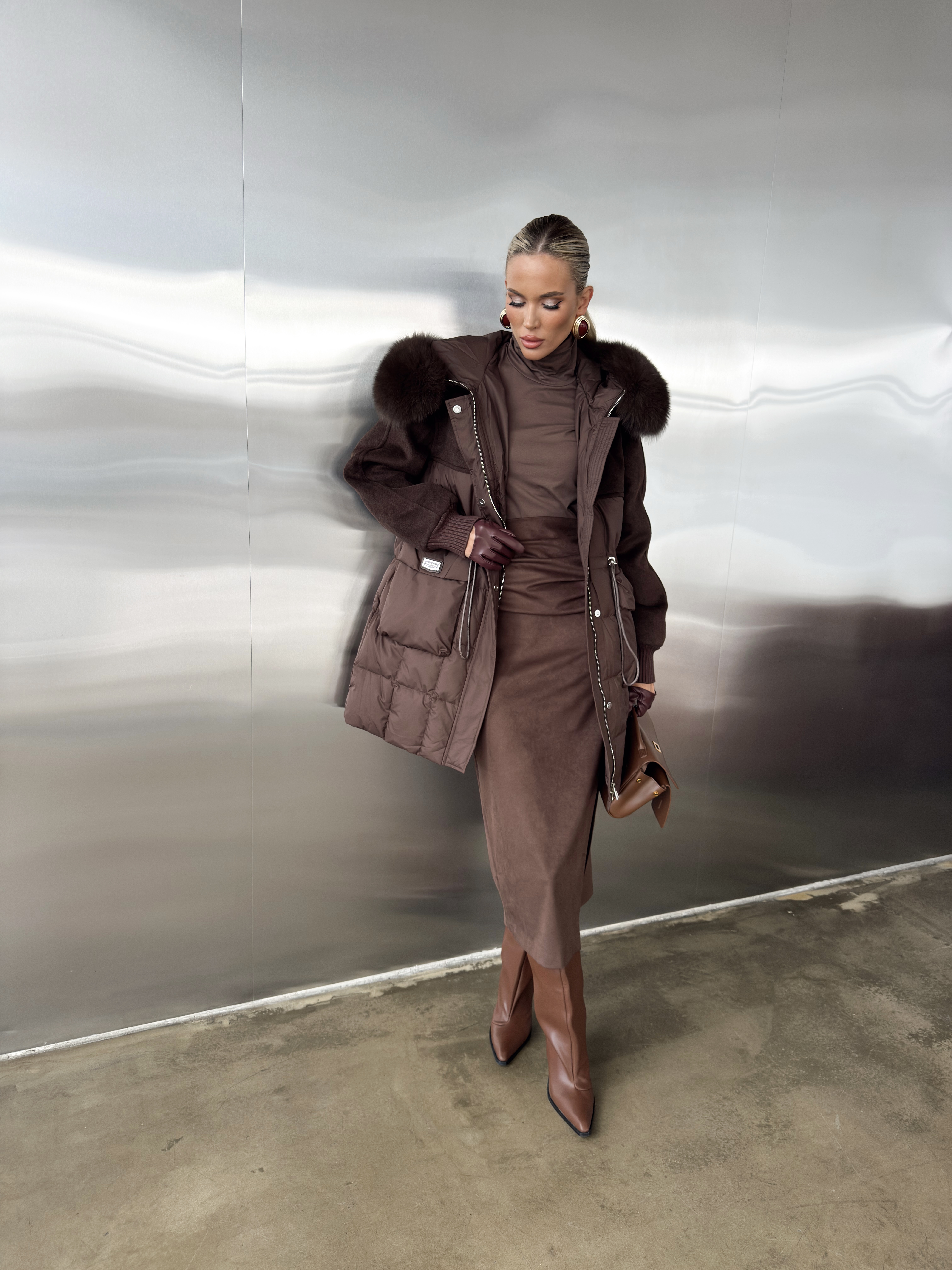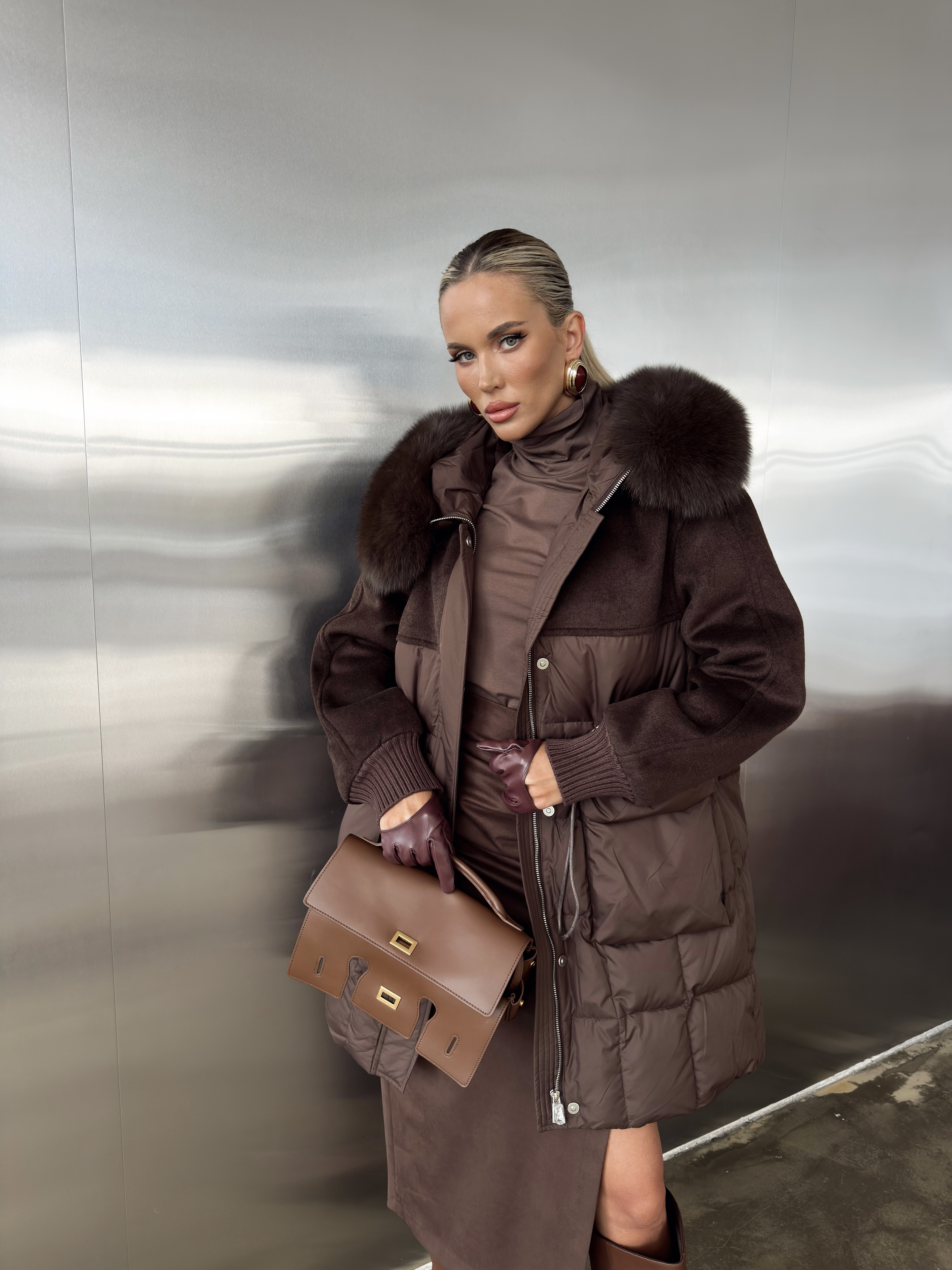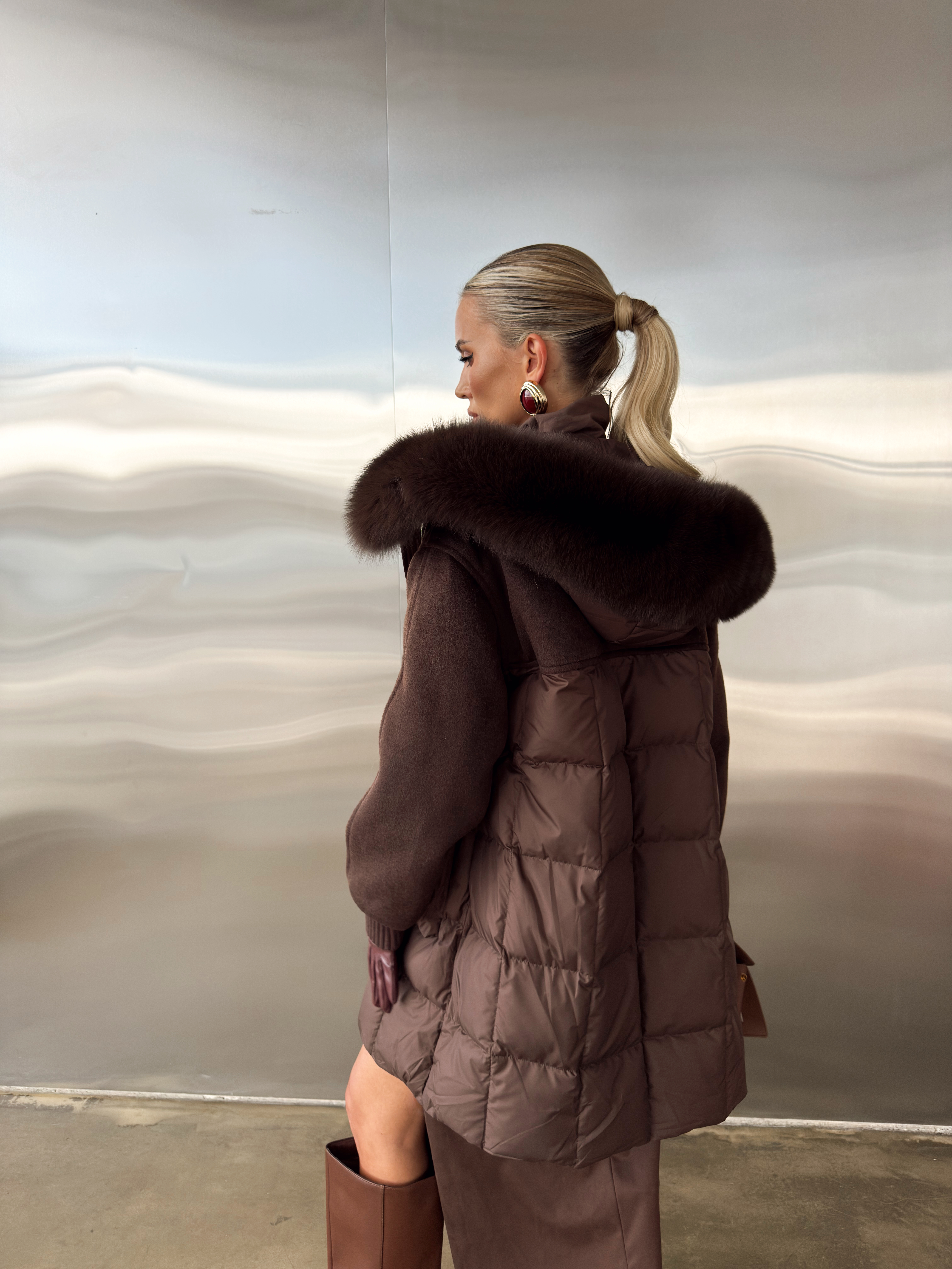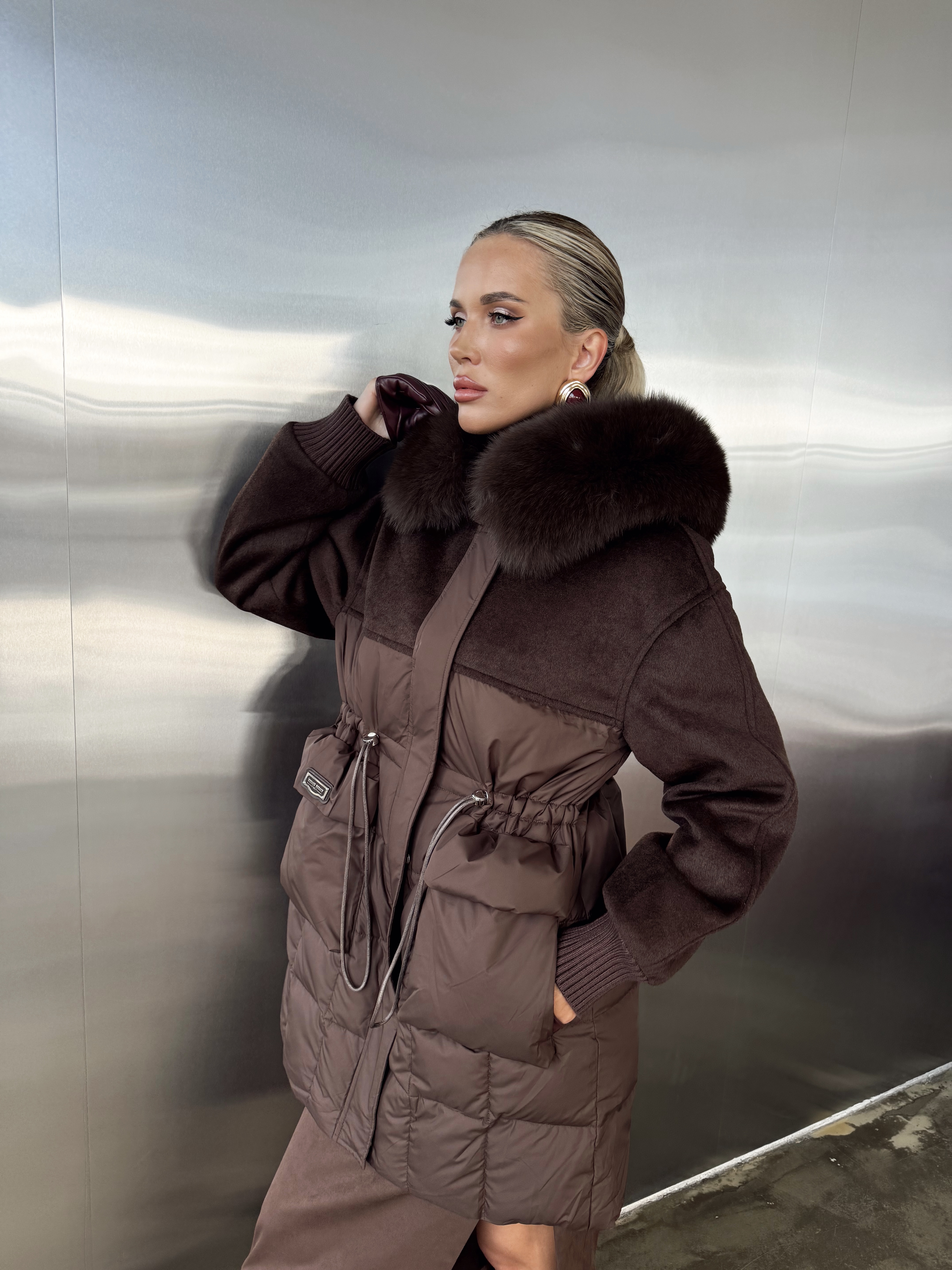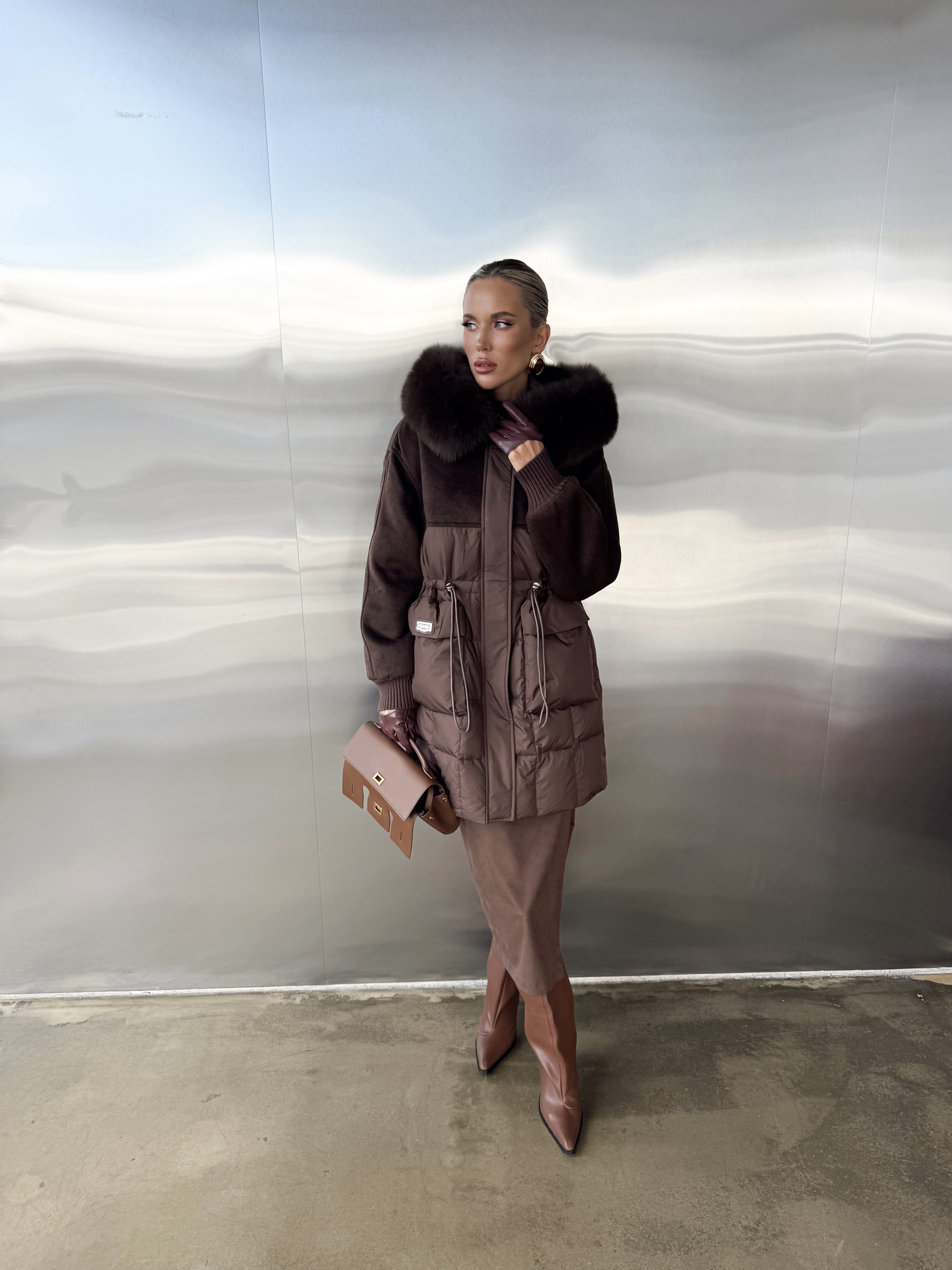 Пуховик комбинированный на кулиске с капюшоном